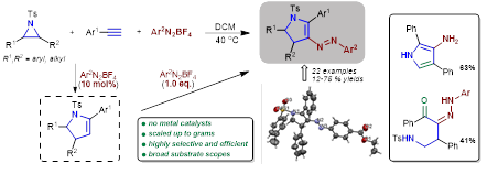 2.Metal-free cascade reactions of aziridines with arylalkynes and aryldiazoniums: facile access to arylazopyrrolines, Org. Biomol. Chem., 2020, 18, 3149. 該文在前期研究工作基礎上,使用氮丙環(huán)、芳基末端炔與芳基四氟硼酸重氮鹽為反應底物,經(jīng)過三組分串聯(lián)反應,高效、精準的構(gòu)建了4-(芳基二氮烯基)-2,3-二氫吡咯衍生物。該方法不使用金屬,反應條件溫和,簡便易行,可實現(xiàn)克級合成。鑒于偶氮化合物廣泛應用于材料科學和有機合成,如染料、傳感器、紡織品和催化劑配體等,方法將在化工和紡織等領域有重要意義。