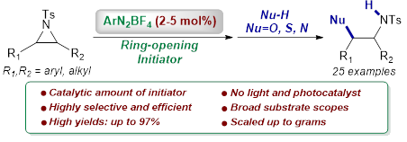 1.Aryldiazonium ion initiated C–N bond cleavage for the versatile, efficient and regioselective ring opening of aziridines, Org. Chem. Front., 2019, 6, 1832。該文報道了一種芳基重氮鹽引發(fā)氮丙環(huán)選擇性開環(huán)反應的新策略,與多種親核試劑作用生成含氮分子化合物,反應在室溫中進行,開環(huán)過程對各種親核試劑(包括[O]、[S]和[N])均高效適用。這一高度區(qū)域選擇性的過程,可以實現(xiàn)克級合成,具有操作簡單,條件溫和、無金屬的條件。初步的機理研究發(fā)現(xiàn),反應可能以自由基方式開環(huán)。