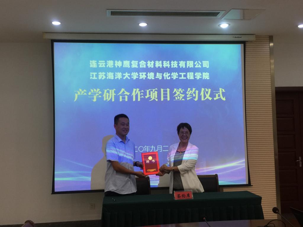 儀式上,環(huán)境與化學(xué)工程學(xué)院與連云港神鷹復(fù)合材料科技有限公司雙方代表簽訂了產(chǎn)學(xué)研合作協(xié)議書(shū)及技術(shù)開(kāi)發(fā)合同,連云港神鷹復(fù)合材料科技有限公司總經(jīng)理周恒香為陶傳洲教授頒發(fā)了科技副總聘書(shū)。