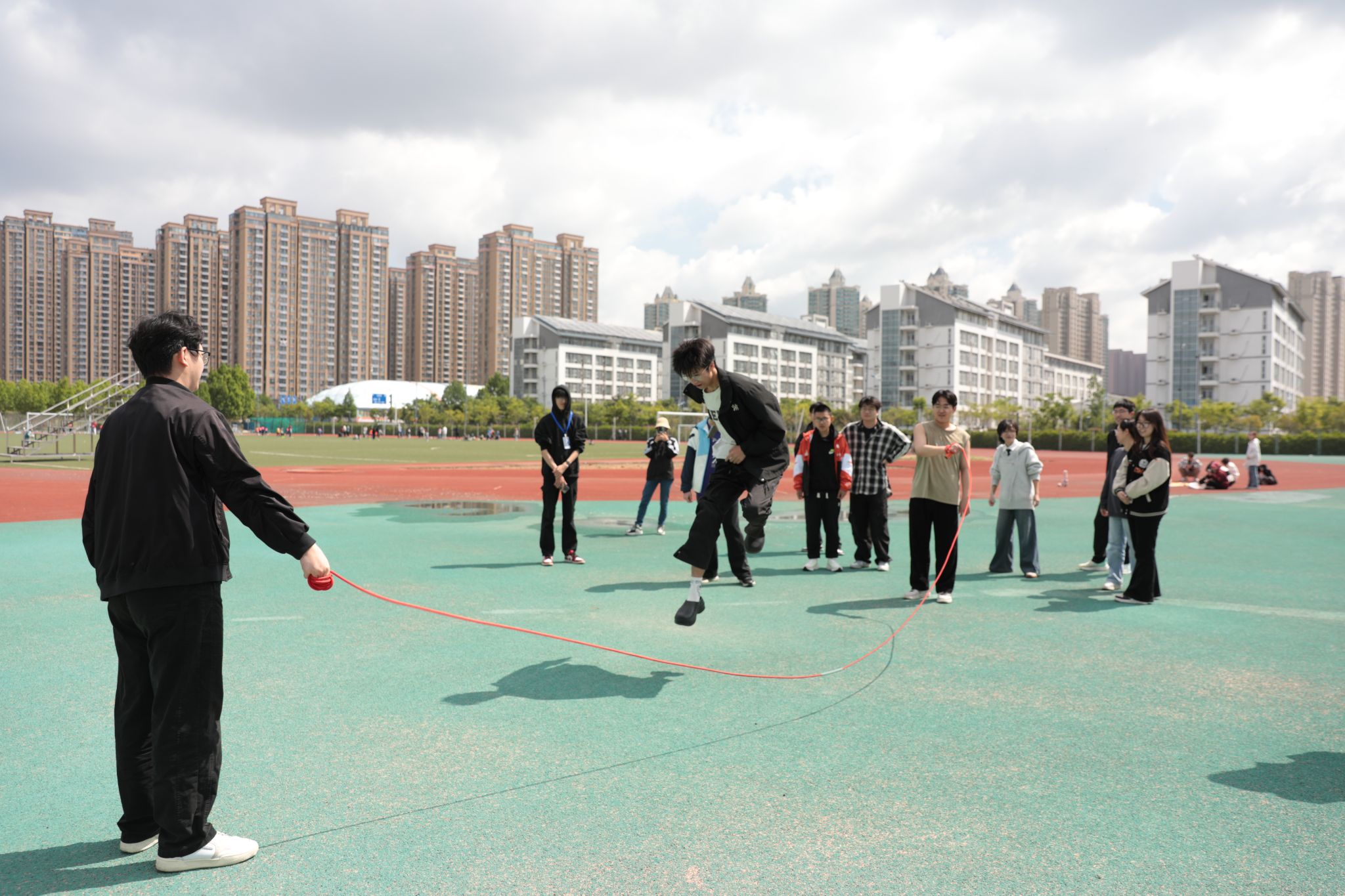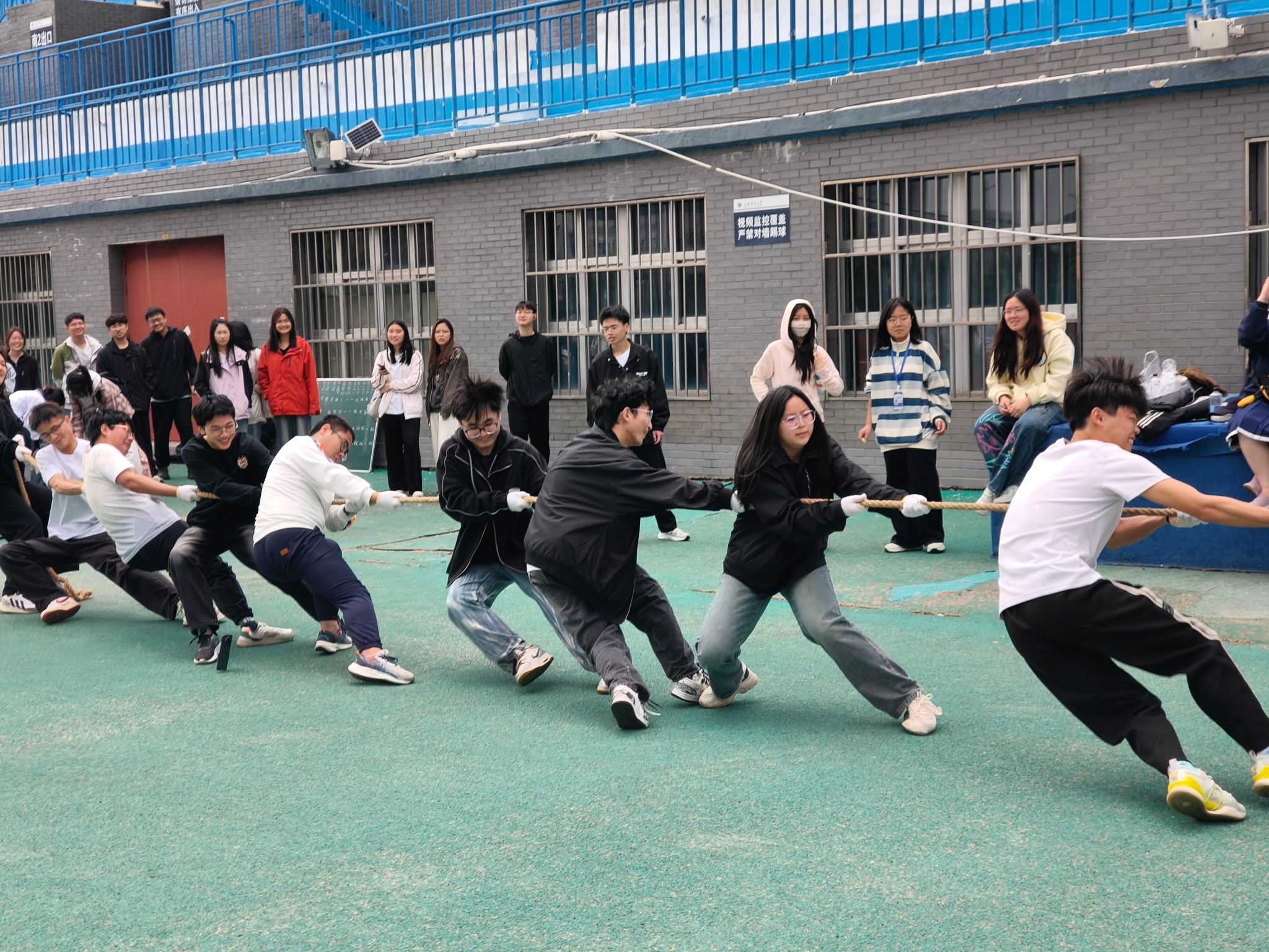 活動期間,各專業(yè)以團體形式展開比拼。游戲設(shè)有跳大繩、扔沙包、旋風(fēng)跑、投壺、拔河五項活動。跳大繩時,同學(xué)們節(jié)奏明快,輕盈跳躍;扔沙包環(huán)節(jié),大家互相切磋,精準(zhǔn)投擲得分區(qū)域;旋風(fēng)跑里,同學(xué)們風(fēng)馳電掣,你追我趕;投壺項目,大家冷靜沉著,專注投入;拔河比賽,現(xiàn)場吶喊助威聲此起彼伏。陣陣歡呼聲、加油聲讓整個操場都沉浸在熱烈沸騰、活力四射的氣氛之中。