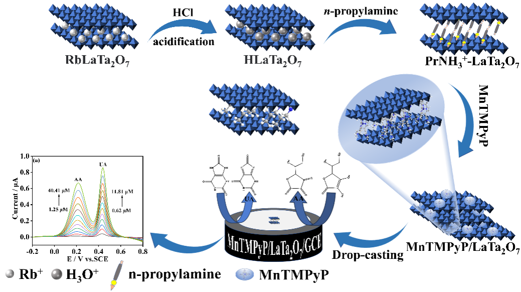 MnTMPyP/LaTa2O7納米復(fù)合材料的制備流程示意圖以及在抗壞血酸和尿酸檢測(cè)中的應(yīng)用