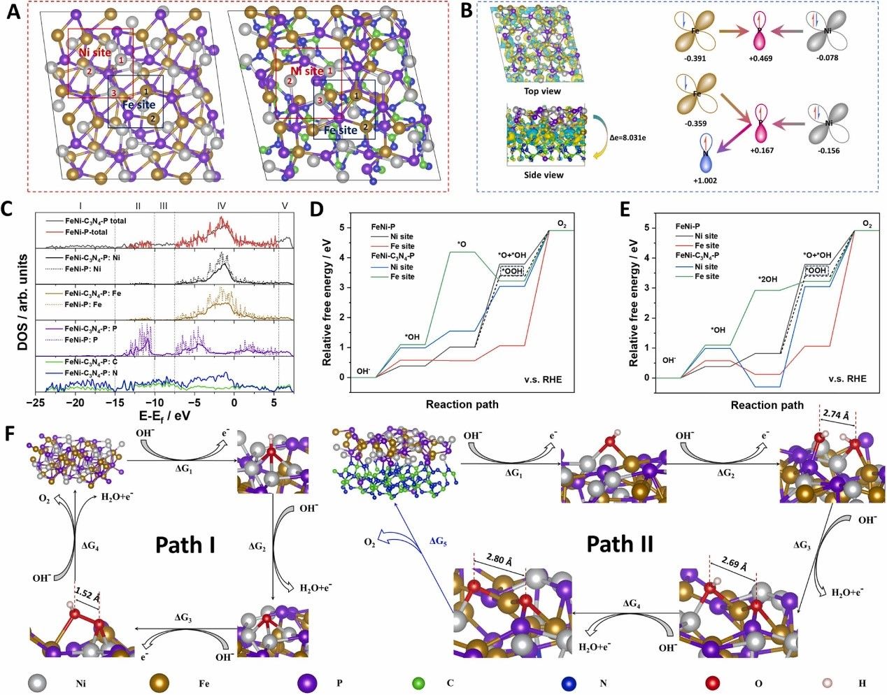 FeNi-P和FeNi-C3N4-P中Fe-Ni雙中心的OER機(jī)理和催化結(jié)構(gòu)